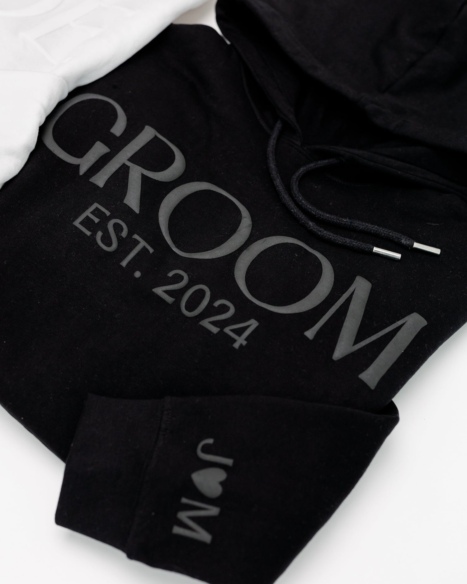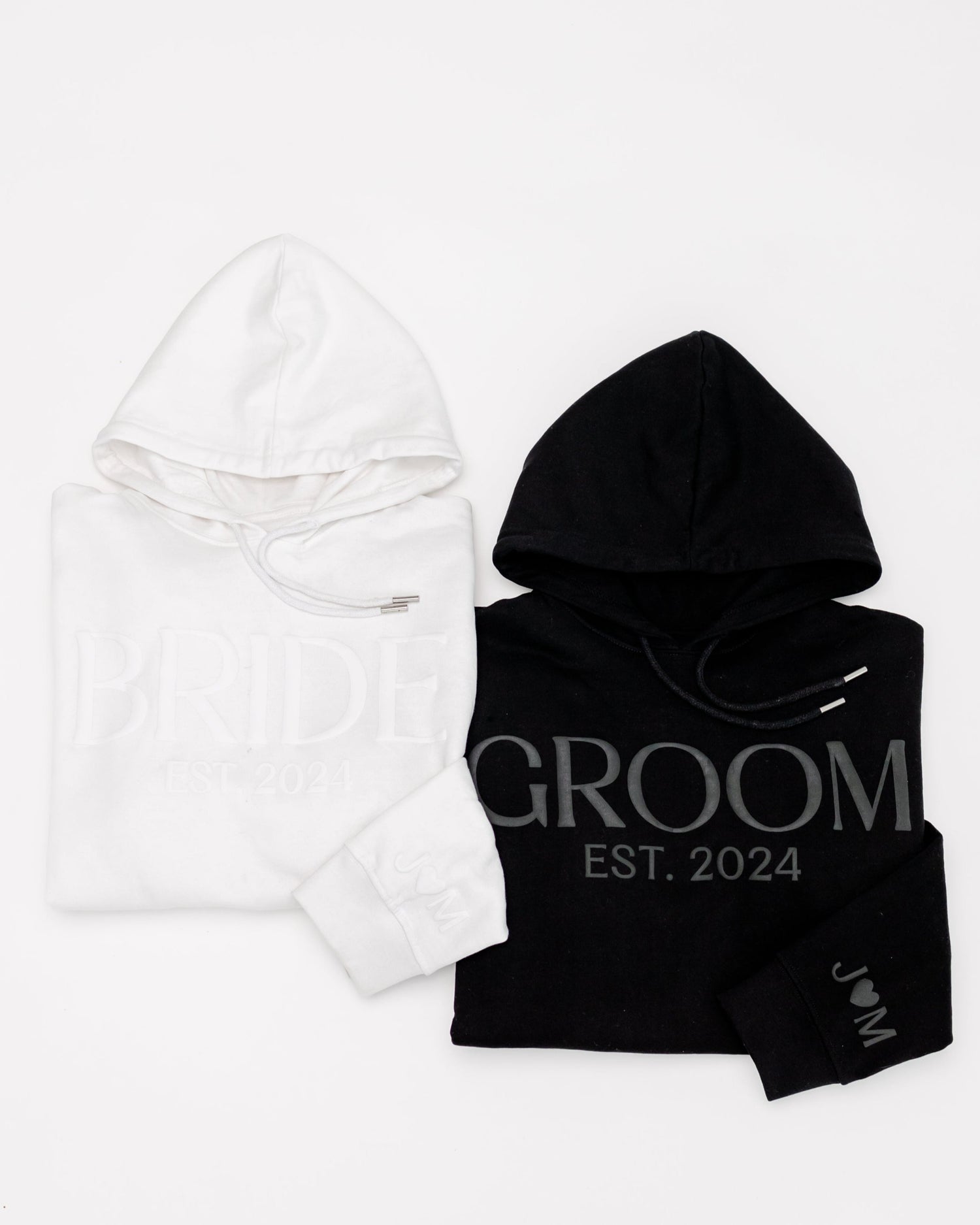Celebrate your love story in matching style with our embossed BRIDE & GROOM hoodie and jogger sets.