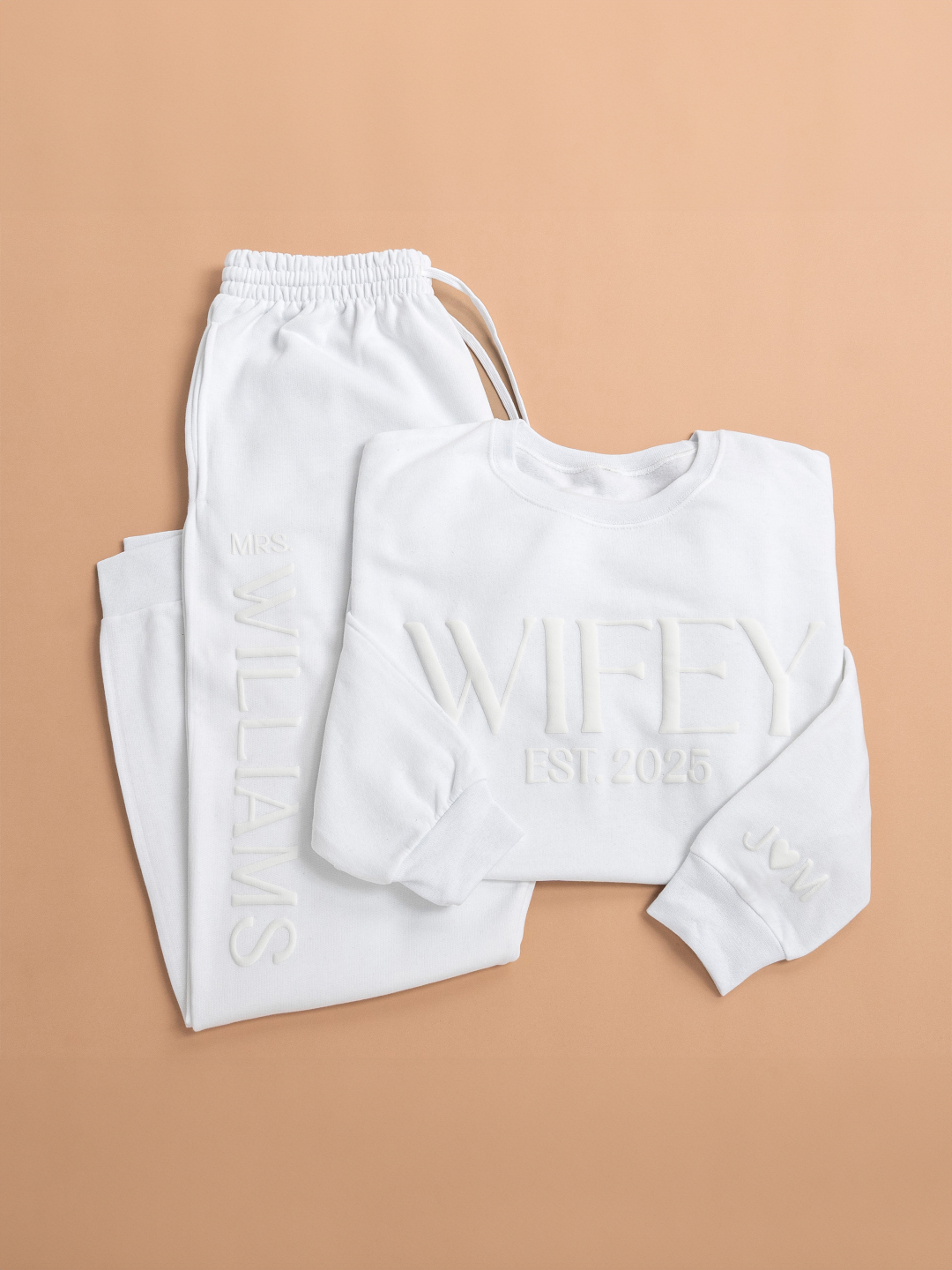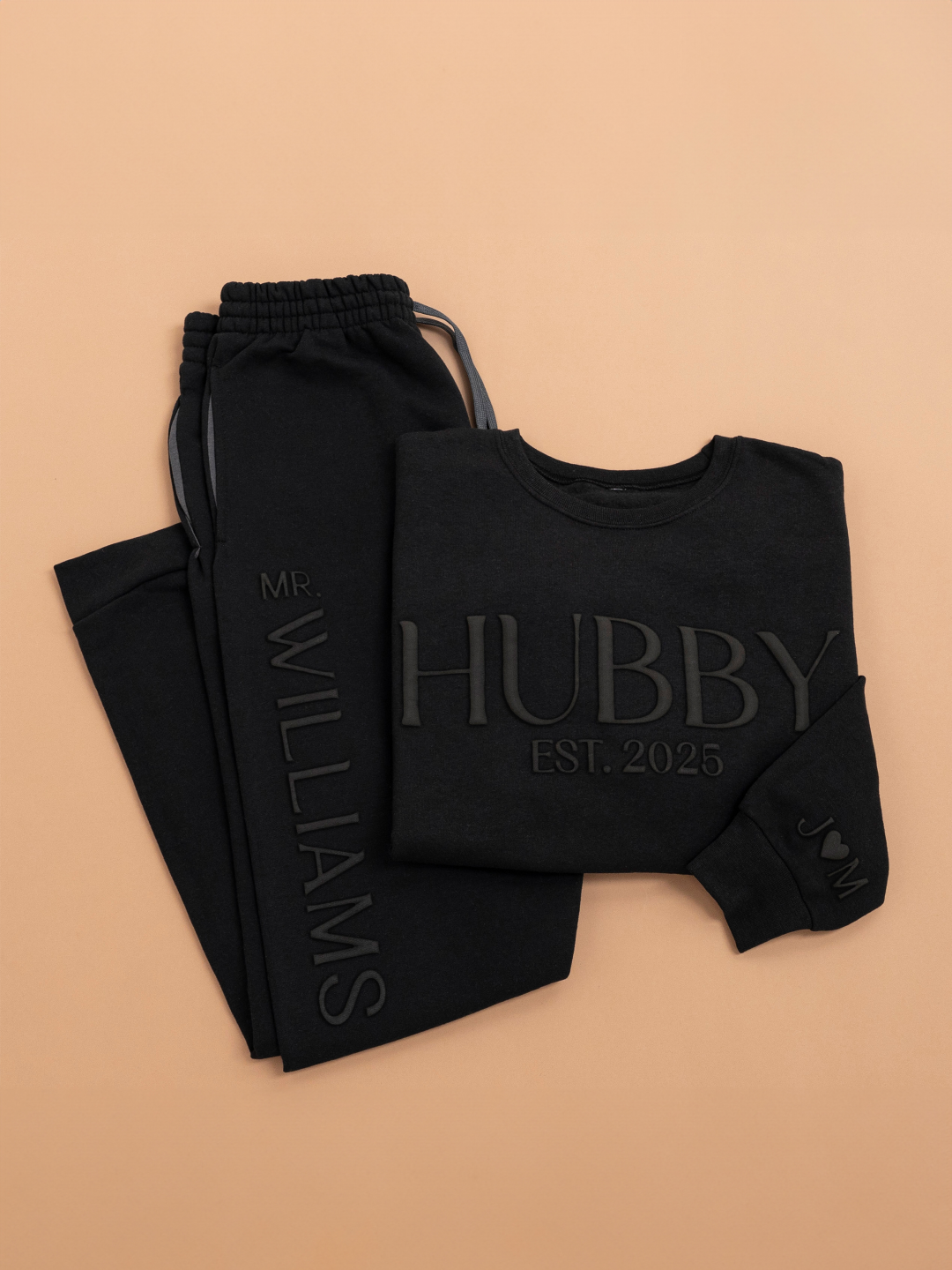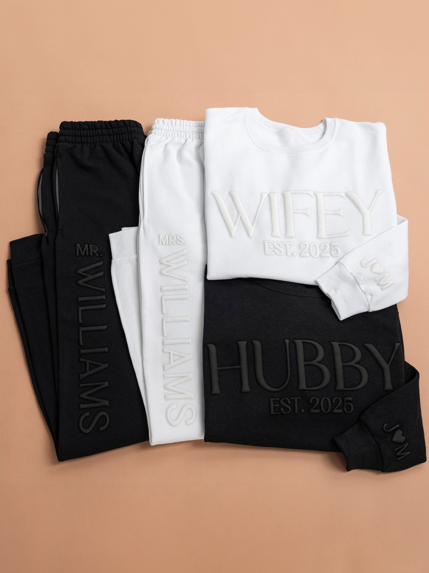 Embossed WIFEY & HUBBY Sweatshirt/Joggers Sets - Monochrome