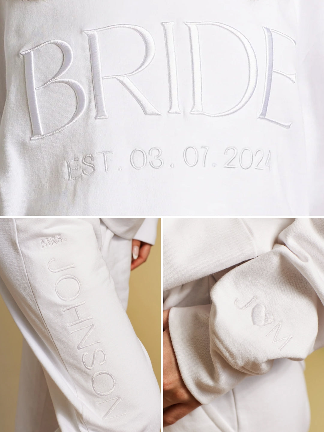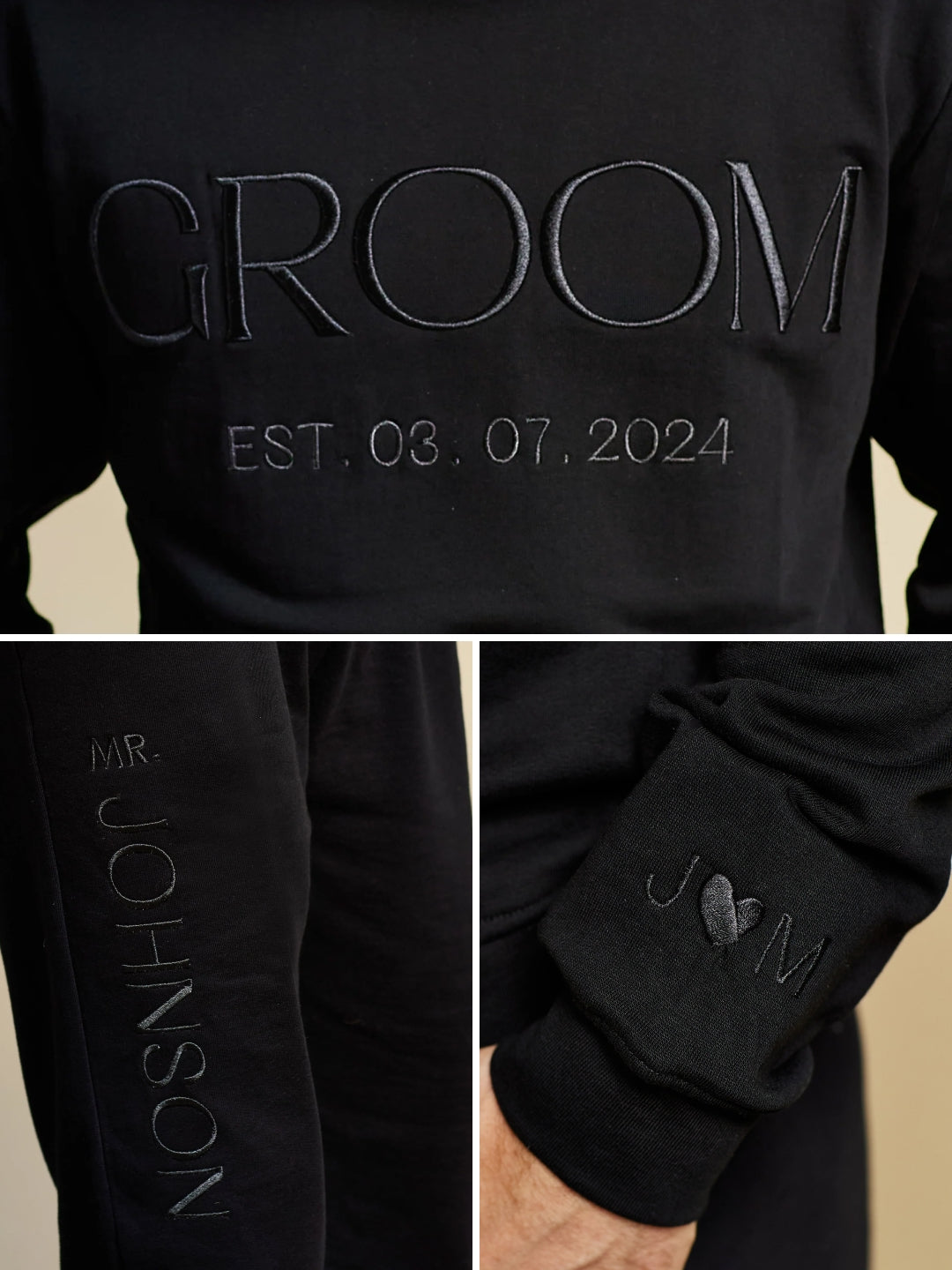- Sweatshirts have BRIDE / GROOM on the front, and joggers have BRIDE / GROOM on the pocket by default and can't be removed.