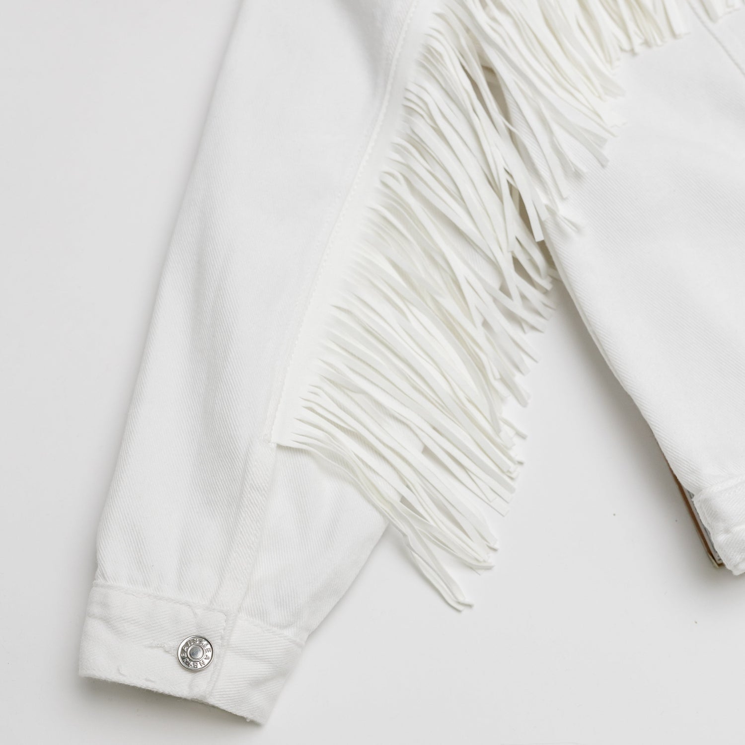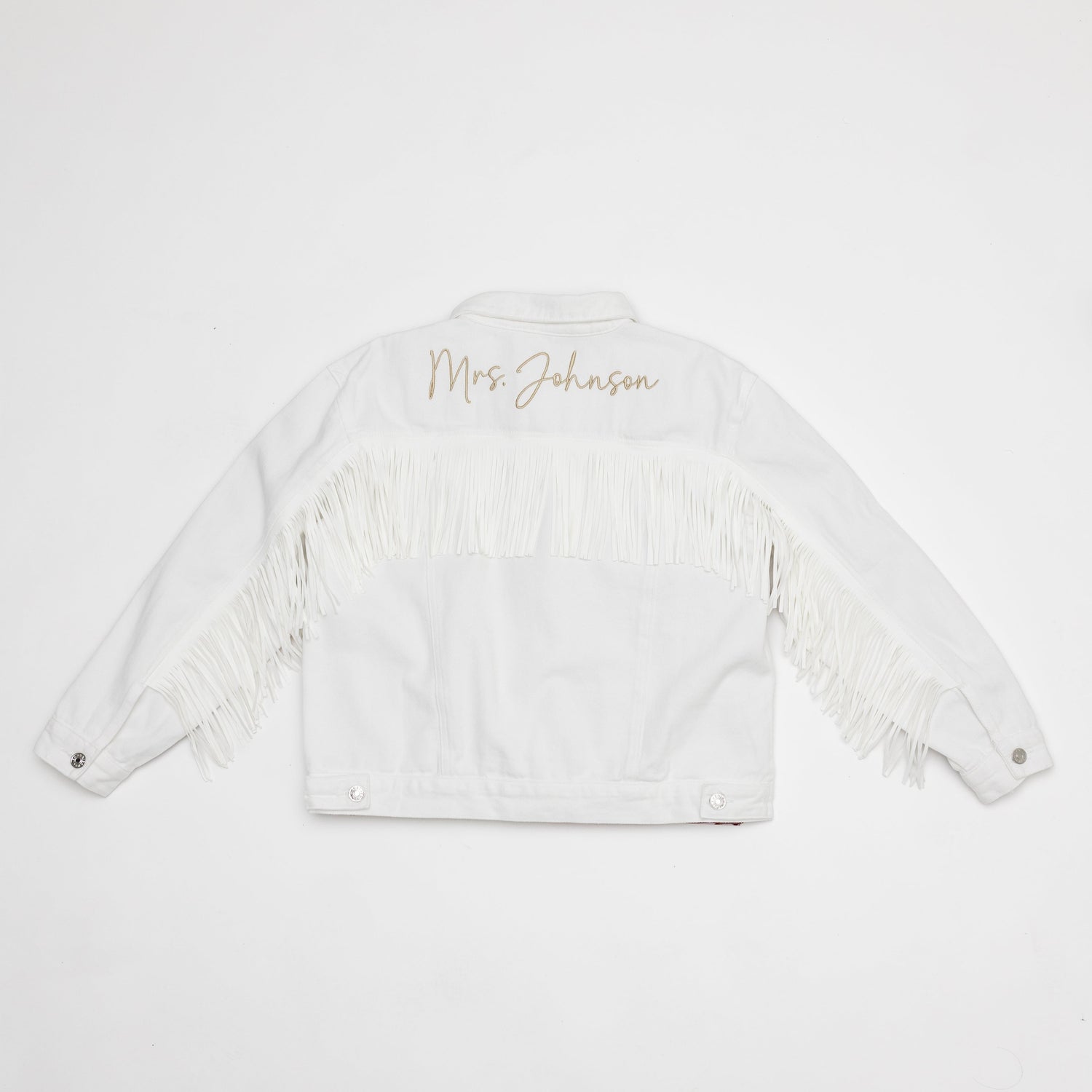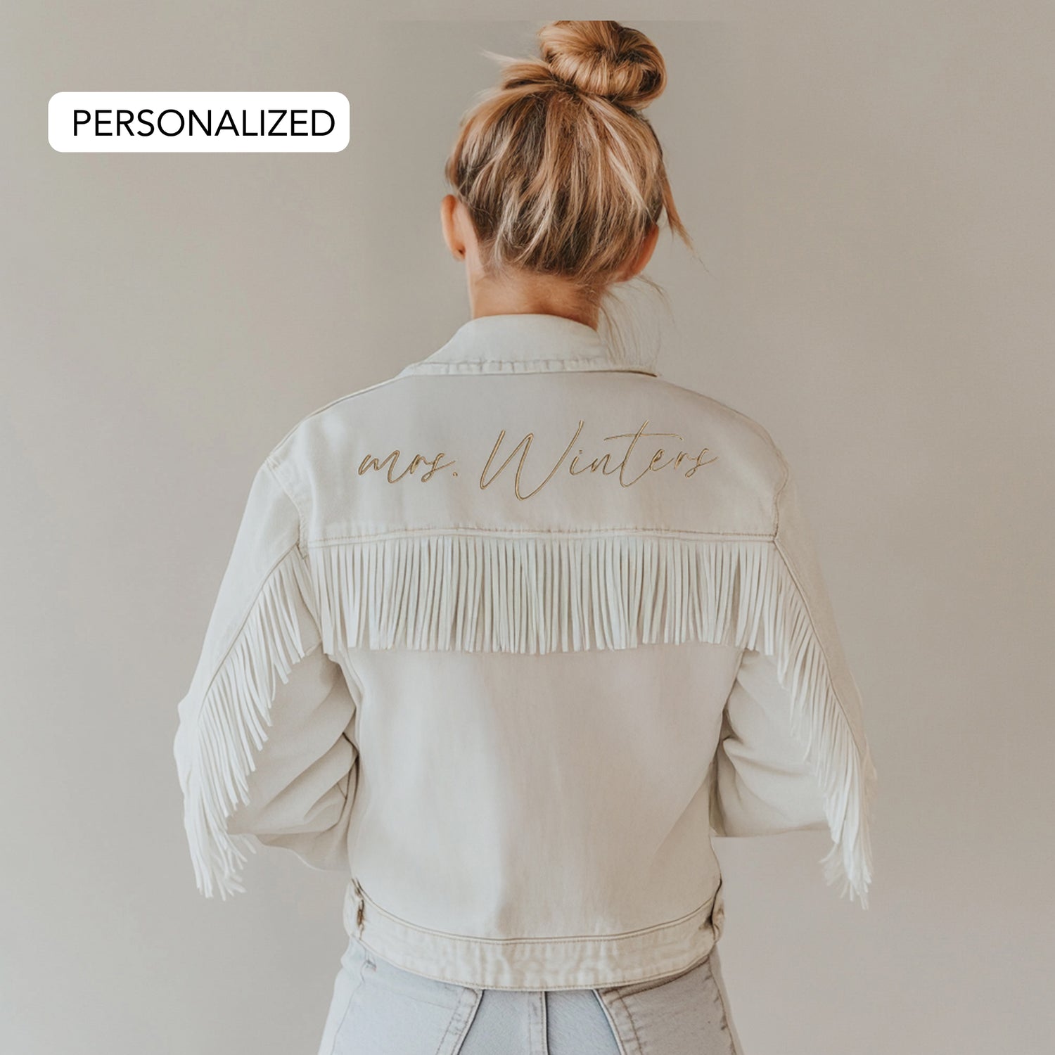 Crafted from soft high-quality denim, this personalized bridal jean jacket with fringes features custom embroidery of your last name and wedding date on the collar.