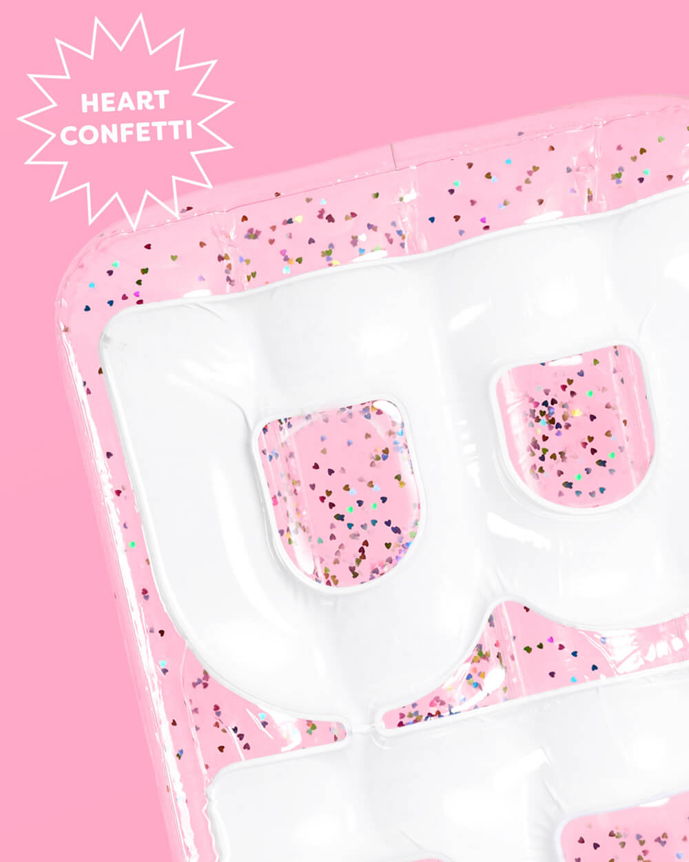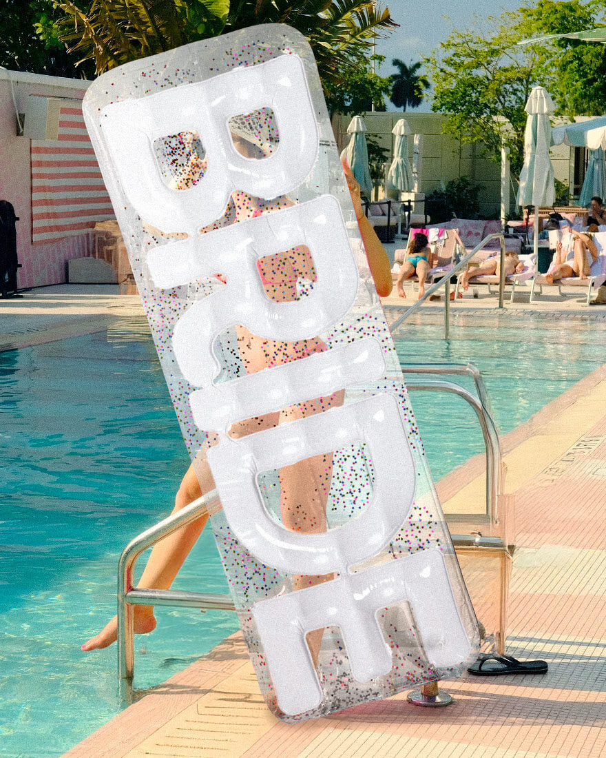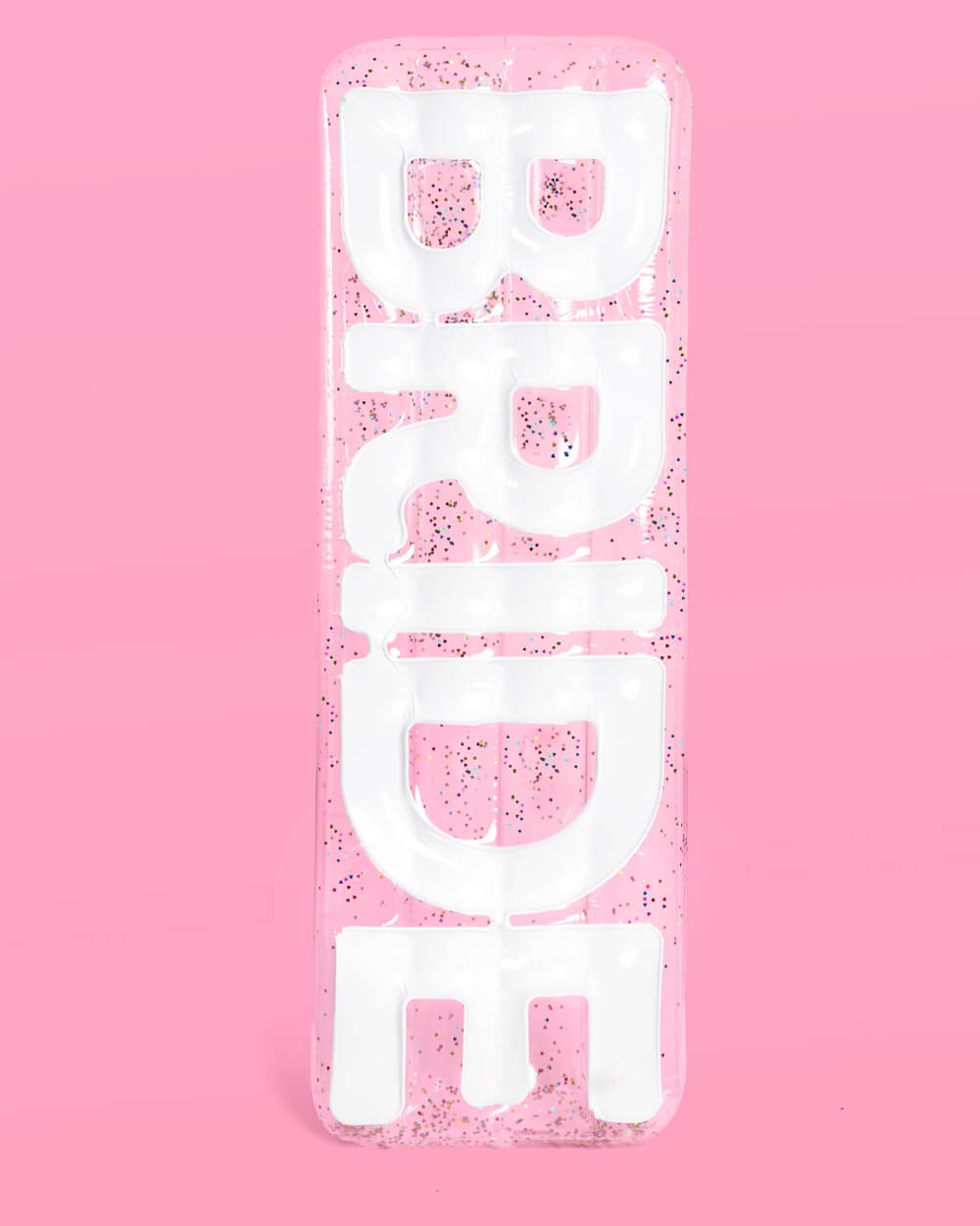Poolside, but make it bridal. This oversized “BRIDE” float is filled with heart-shaped confetti and made for bachelorettes, honeymoons, and iconic photo moments.